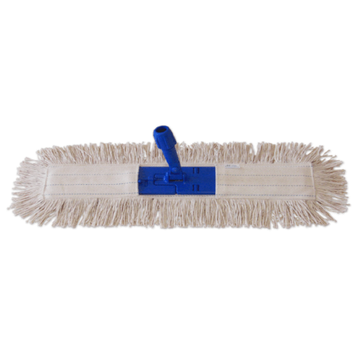 Funda de algodón con ribetes azules muy resistentes que le confieren gran duración. El hilado es 100% algodón , lo cual absorbe mucho más polvo. La medida de ancho es tipo americana y se combina con armazones tanto de hierro como de plástico de la línea PRO. Estas mopas deben utilizarse con secuestrantes o químicos.