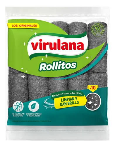 Virulana Rollitos es un paquete que incluye 10 unidades de lana de acero, cada una con un peso de 70 gramos. Este producto es ideal para la limpieza profunda y el mantenimiento de diversas superficies, ayudando a remover la suciedad más difícil sin dañar el material subyacente. La lana de acero es un material resistente y duradero, lo que asegura una larga vida útil y eficiencia en cada uso.